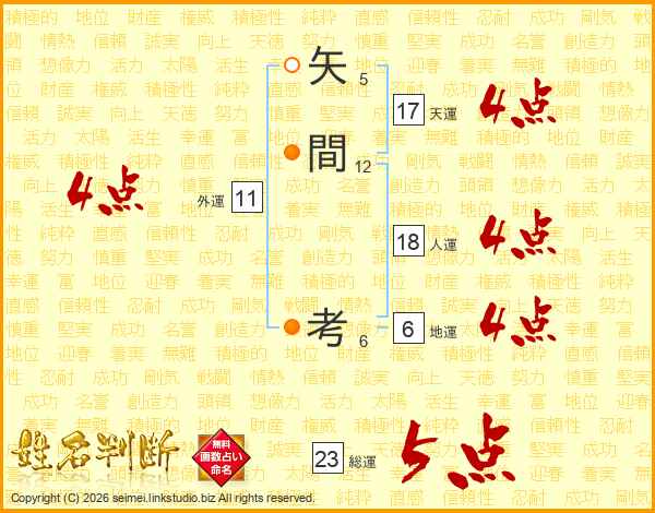 矢間考さんの天運は17画の4点!