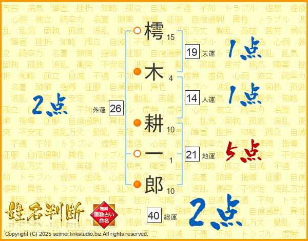 樗(15画)木(4画) 耕(10画)一(1画)郎(10画)