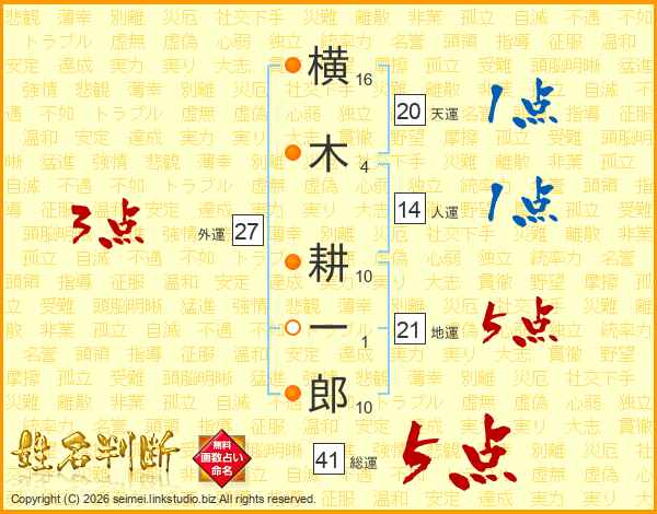横(16画)木(4画) 耕(10画)一(1画)郎(10画)