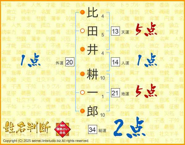 比(4画)田(5画)井(4画) 耕(10画)一(1画)郎(10画)