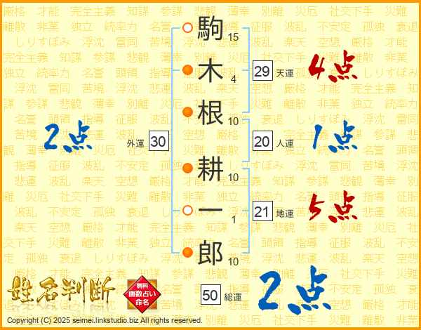 駒(15画)木(4画)根(10画) 耕(10画)一(1画)郎(10画)
