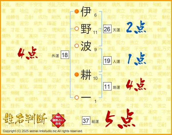 伊(6画)野(11画)波(9画) 耕(10画)一(1画)