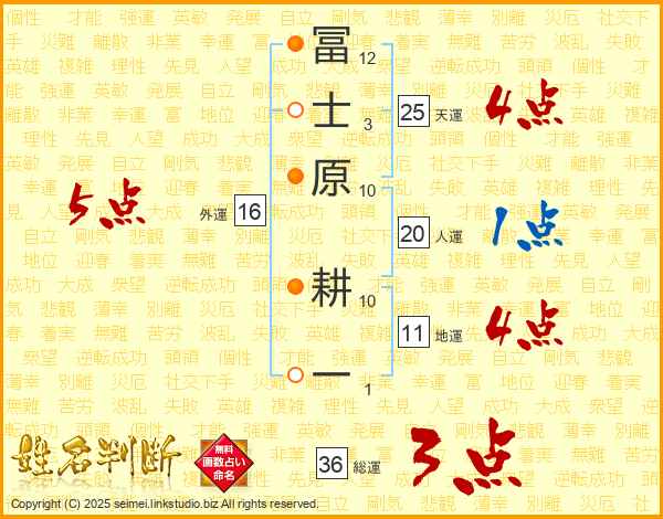 冨(12画)士(3画)原(10画) 耕(10画)一(1画)