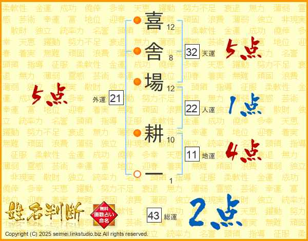喜舎場耕一さんの総運は43画の2点!