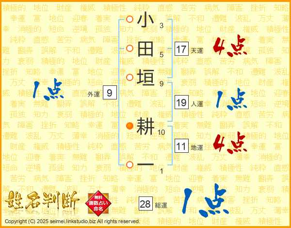小(3画)田(5画)垣(9画) 耕(10画)一(1画)