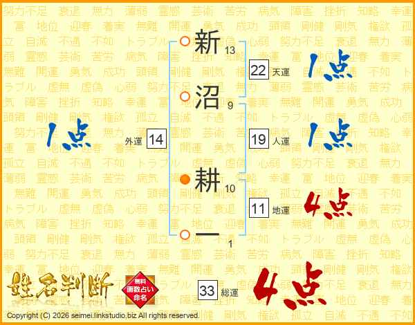 生活面を象徴する運勢です。外部から受ける影響力を表し、結婚運、家庭運や職場、環境への順応性を表します。総運から人運を引いた画数。姓や名が1文字の場合を除く。