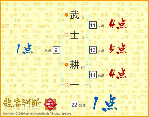生活面を象徴する運勢です。外部から受ける影響力を表し、結婚運、家庭運や職場、環境への順応性を表します。総運から人運を引いた画数。姓や名が1文字の場合を除く。