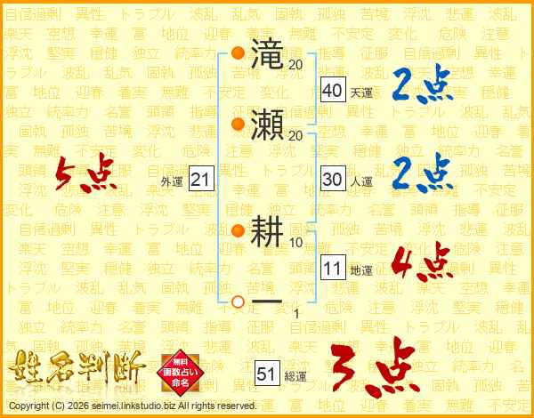 滝(20画)瀬(20画) 耕(10画)一(1画)