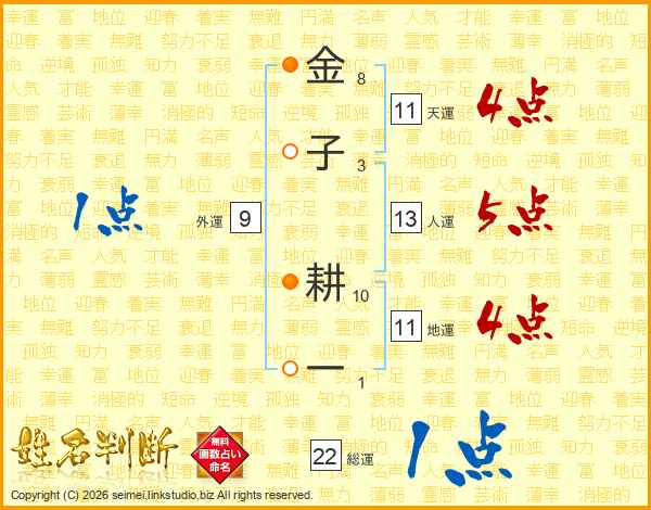金(8画)子(3画) 耕(10画)一(1画)