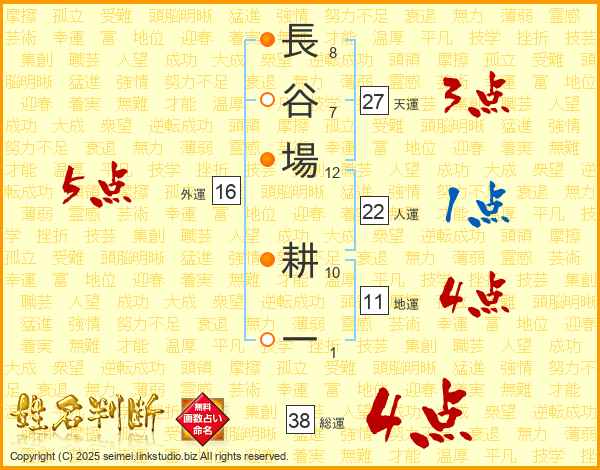 長(8画)谷(7画)場(12画) 耕(10画)一(1画)