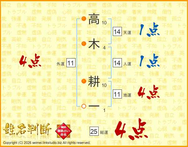 生活面を象徴する運勢です。外部から受ける影響力を表し、結婚運、家庭運や職場、環境への順応性を表します。総運から人運を引いた画数。姓や名が1文字の場合を除く。