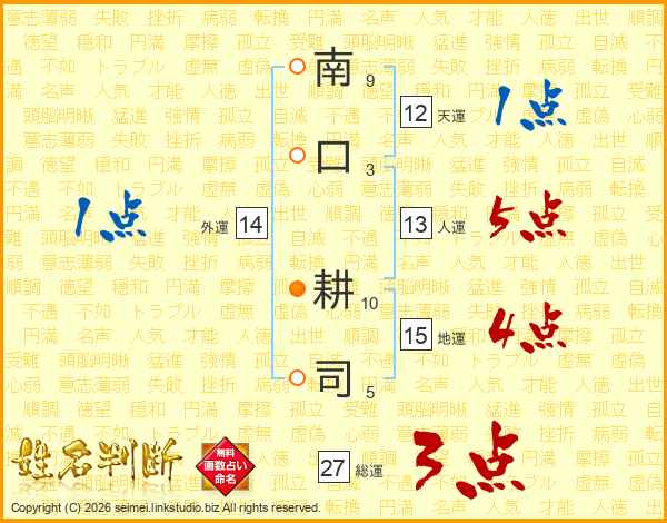 生活面を象徴する運勢です。外部から受ける影響力を表し、結婚運、家庭運や職場、環境への順応性を表します。総運から人運を引いた画数。姓や名が1文字の場合を除く。