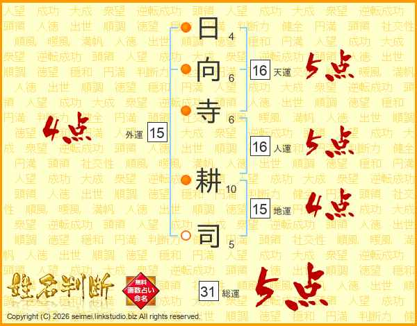 日(4画)向(6画)寺(6画) 耕(10画)司(5画)