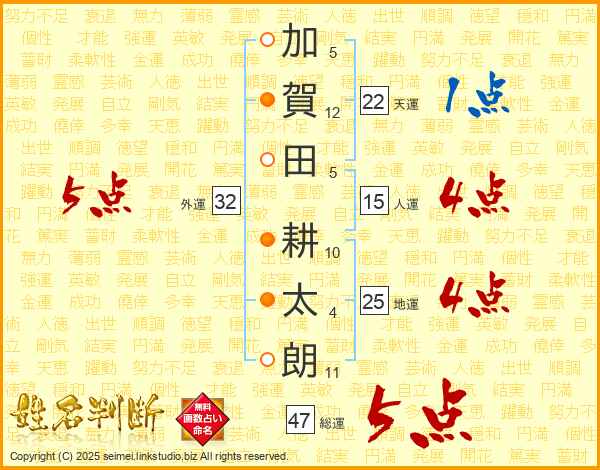 加(5画)賀(12画)田(5画) 耕(10画)太(4画)朗(11画)