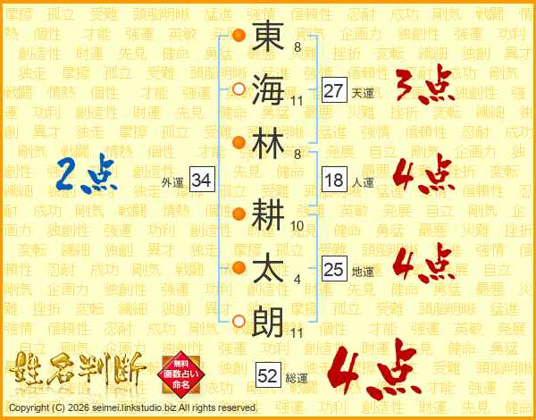 東(8画)海(11画)林(8画) 耕(10画)太(4画)朗(11画)