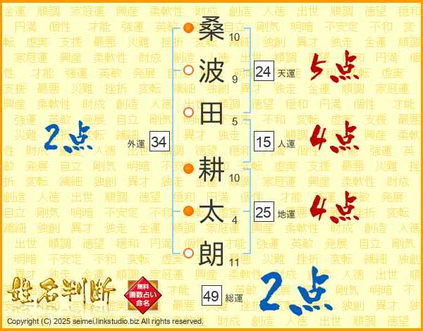 桑(10画)波(9画)田(5画) 耕(10画)太(4画)朗(11画)