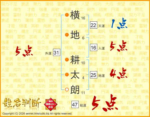 横(16画)地(6画) 耕(10画)太(4画)朗(11画)