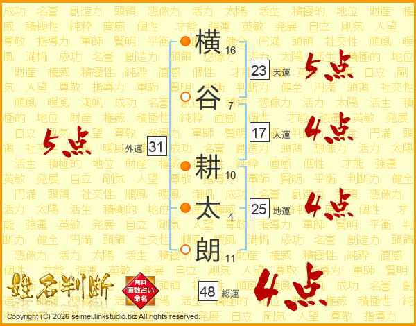 横(16画)谷(7画) 耕(10画)太(4画)朗(11画)
