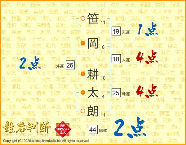 笹(11画)岡(8画) 耕(10画)太(4画)朗(11画)