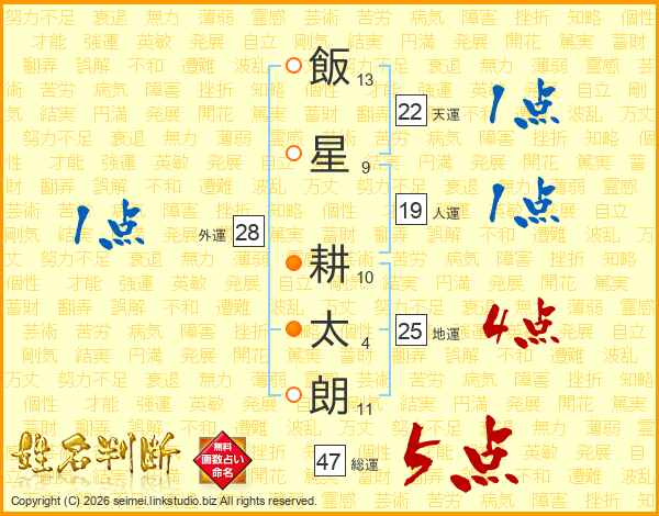 飯(13画)星(9画) 耕(10画)太(4画)朗(11画)