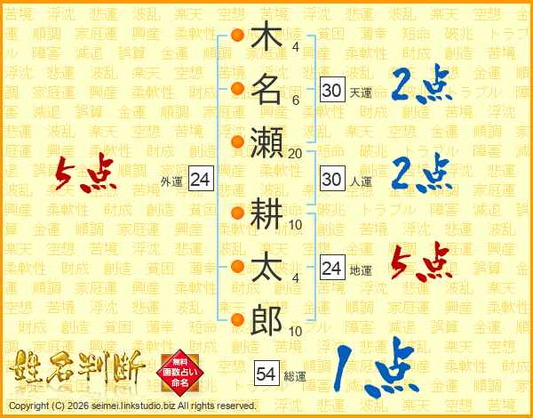 木(4画)名(6画)瀬(20画) 耕(10画)太(4画)郎(10画)
