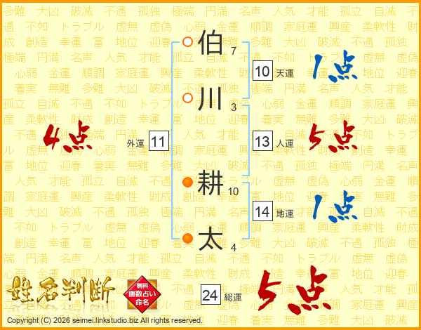 伯(7画)川(3画) 耕(10画)太(4画)
