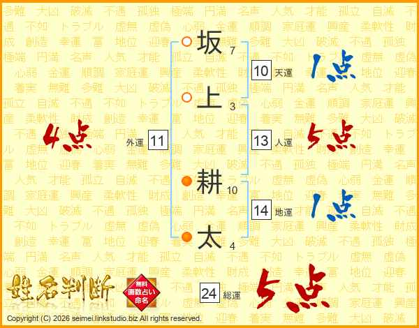 生活面を象徴する運勢です。外部から受ける影響力を表し、結婚運、家庭運や職場、環境への順応性を表します。総運から人運を引いた画数。姓や名が1文字の場合を除く。