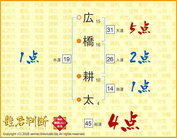 広(15画)橋(16画) 耕(10画)太(4画)