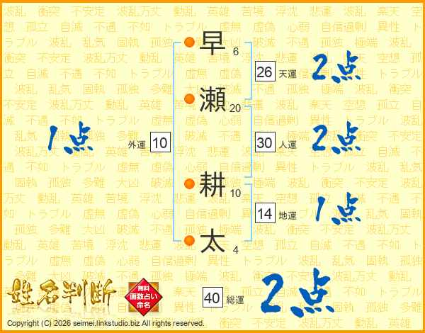 早(6画)瀬(20画) 耕(10画)太(4画)