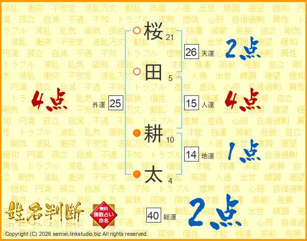 桜田耕太さんの天運は26画の2点!
