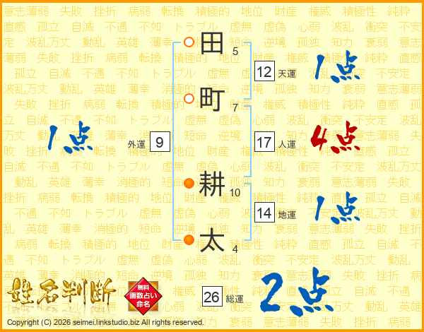 田(5画)町(7画) 耕(10画)太(4画)