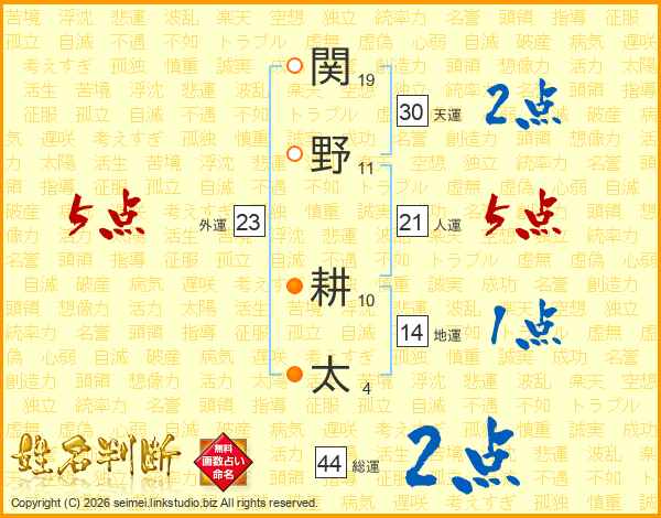 関野耕太さんの人運は21画の5点!