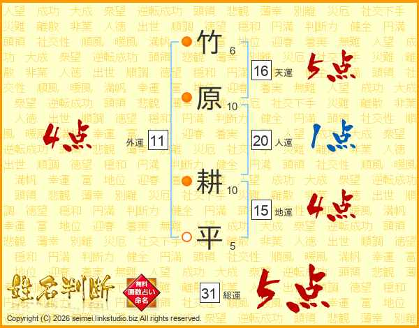 あなたの人生を表す1番重要な運勢です。生涯を通じて影響する総合運となり、主に50歳以降の晩年期に影響を及ぼします。苗字と名前の合計画数。