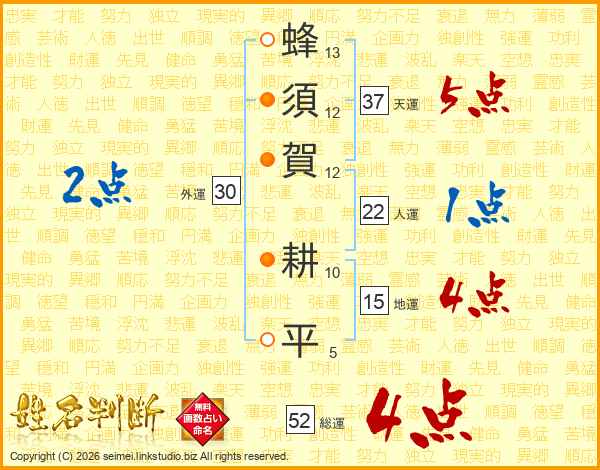 蜂(13画)須(12画)賀(12画) 耕(10画)平(5画)