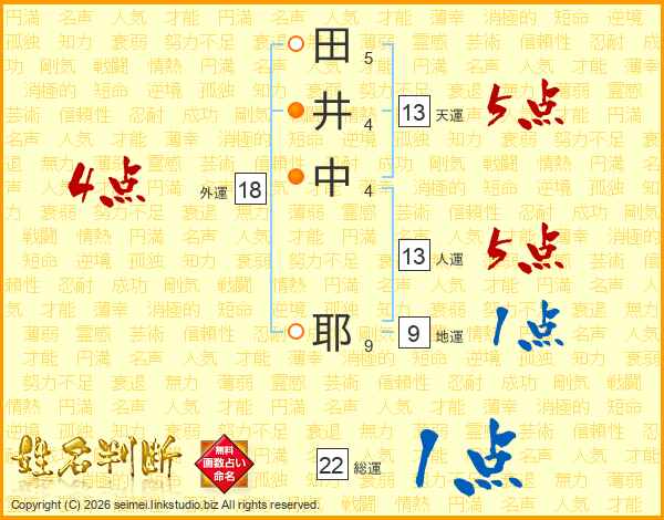 生活面を象徴する運勢です。外部から受ける影響力を表し、結婚運、家庭運や職場、環境への順応性を表します。総運から人運を引いた画数。姓や名が1文字の場合を除く。
