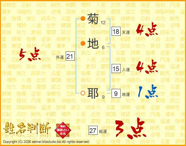 生活面を象徴する運勢です。外部から受ける影響力を表し、結婚運、家庭運や職場、環境への順応性を表します。総運から人運を引いた画数。姓や名が1文字の場合を除く。