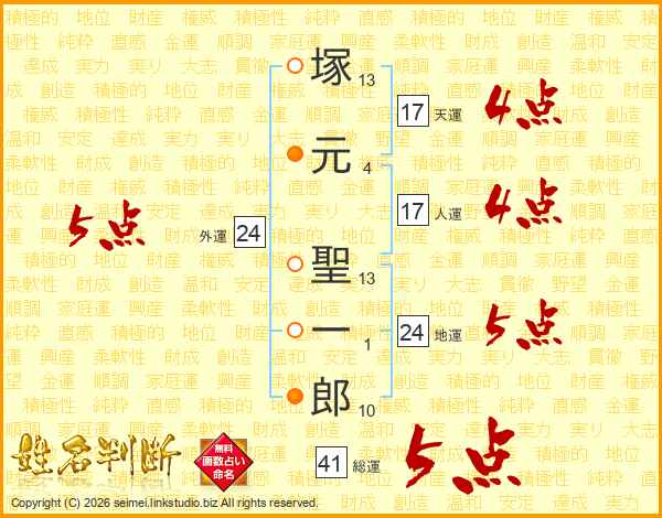 塚(13画)元(4画) 聖(13画)一(1画)郎(10画)