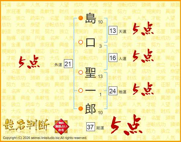 島(10画)口(3画) 聖(13画)一(1画)郎(10画)