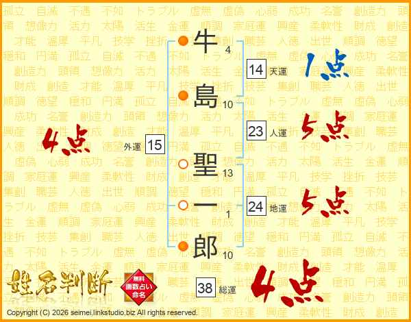 牛(4画)島(10画) 聖(13画)一(1画)郎(10画)