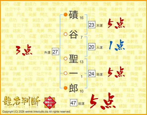磧(16画)谷(7画) 聖(13画)一(1画)郎(10画)
