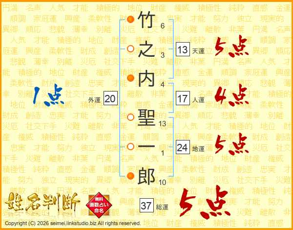竹之内聖一郎さんの総運は37画の5点!