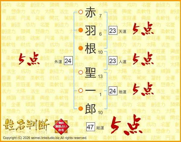 赤(7画)羽(6画)根(10画) 聖(13画)一(1画)郎(10画)