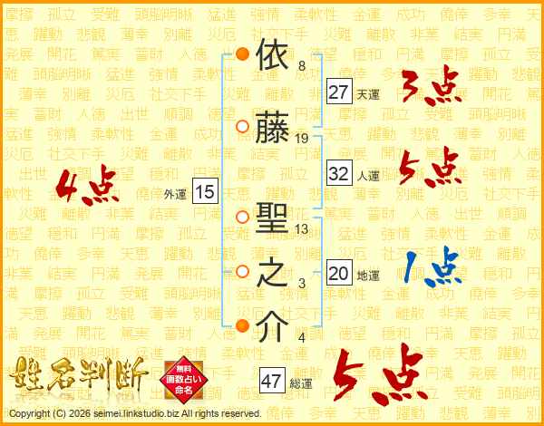 依(8画)藤(19画) 聖(13画)之(3画)介(4画)