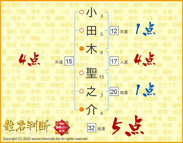 小(3画)田(5画)木(4画) 聖(13画)之(3画)介(4画)