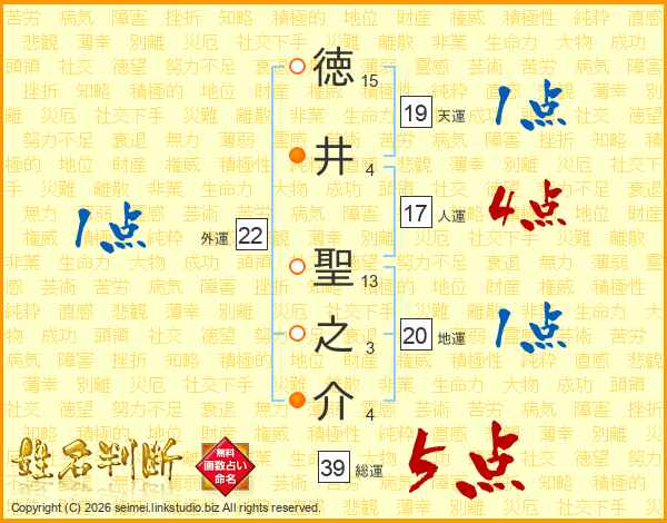 徳(15画)井(4画) 聖(13画)之(3画)介(4画)