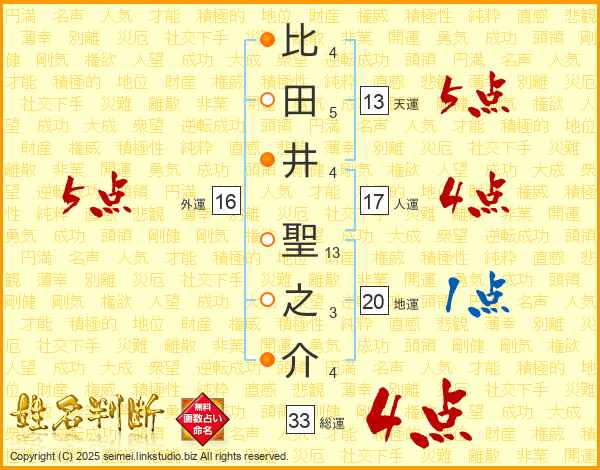 比(4画)田(5画)井(4画) 聖(13画)之(3画)介(4画)