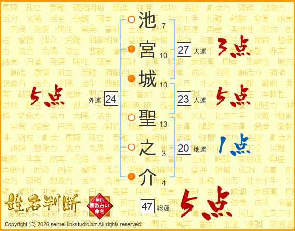 池(7画)宮(10画)城(10画) 聖(13画)之(3画)介(4画)
