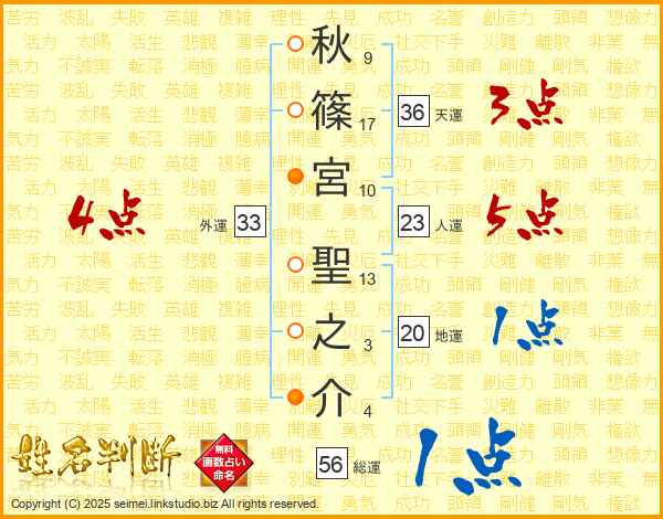 秋(9画)篠(17画)宮(10画) 聖(13画)之(3画)介(4画)