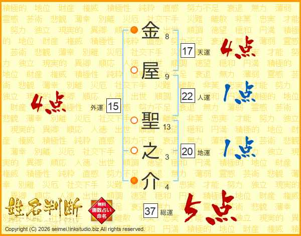 金(8画)屋(9画) 聖(13画)之(3画)介(4画)