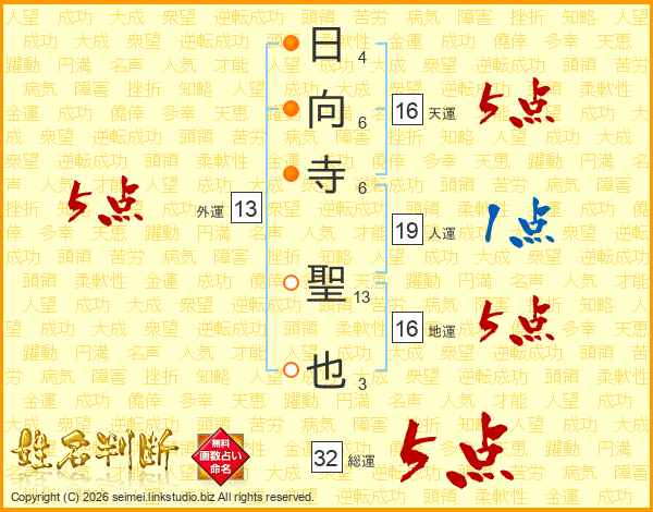 日(4画)向(6画)寺(6画) 聖(13画)也(3画)